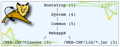 - Webapp: Para cada aplicación desplegada tomcat crea un class loader que carga clases ubicadas en /WEB-INF/classes y clases dentro de jars ubicados en /WEB-INF/lib